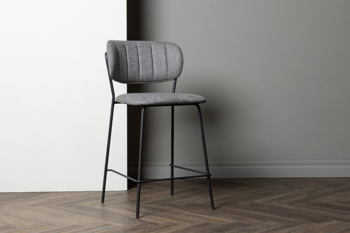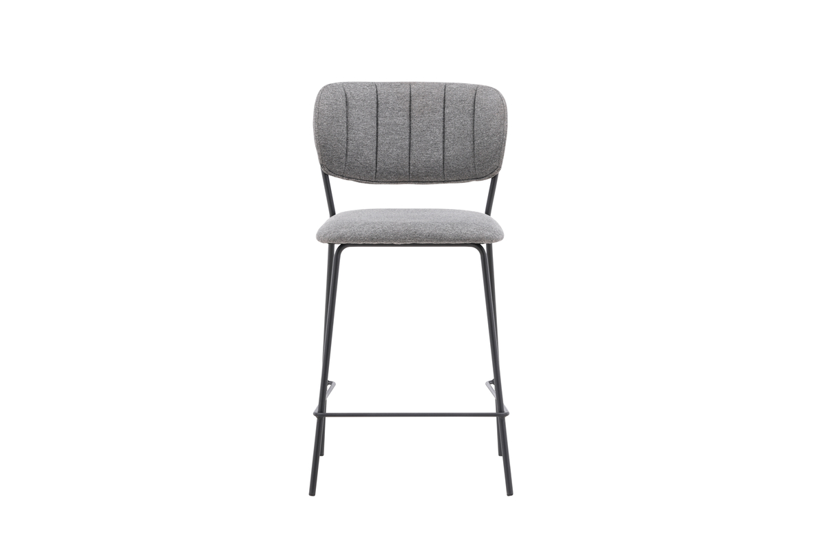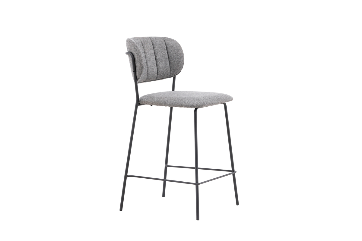 Richt het hart van je huis modern, comfortabel en tijdloos in met een opvallende barkruk uit de Marko-serie in stijlvol design! Deze barkruk heeft een volledig gestoffeerd ontwerp met een licht afgeronde rugleuning en zitting in grijze polyesterstof met elegante sierstiksels. De stoelpoten zijn smal uitgevoerd in zwart staal en voorzien van een geïntegreerde voetsteun – gegarandeerd net zo stijlvol als comfortabel.