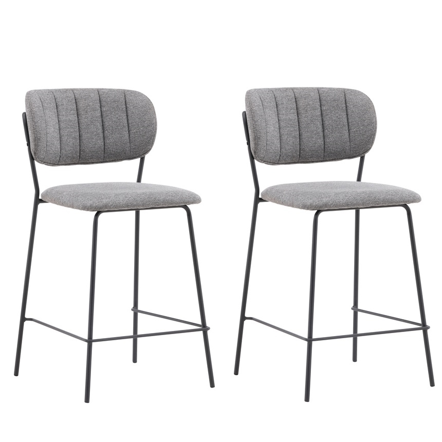 Deze barkruk heeft een volledig gestoffeerd ontwerp met een licht afgeronde rugleuning en zitting in grijze polyesterstof met elegante sierstiksels. De stoelpoten zijn smal uitgevoerd in zwart staal en voorzien van een geïntegreerde voetsteun – gegarandeerd net zo stijlvol als comfortabel.