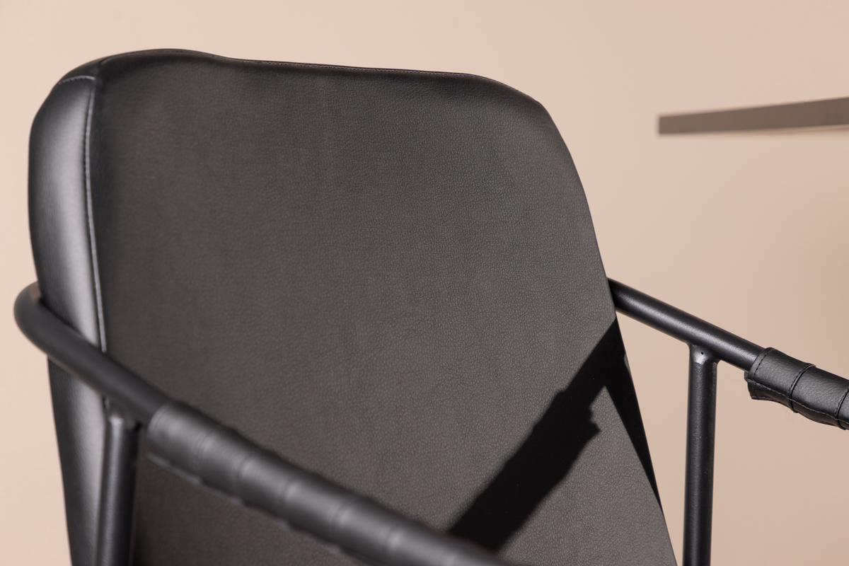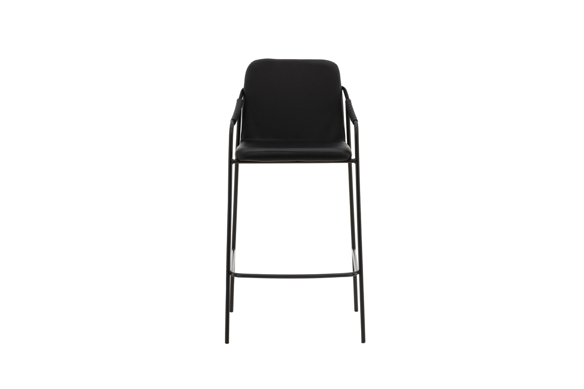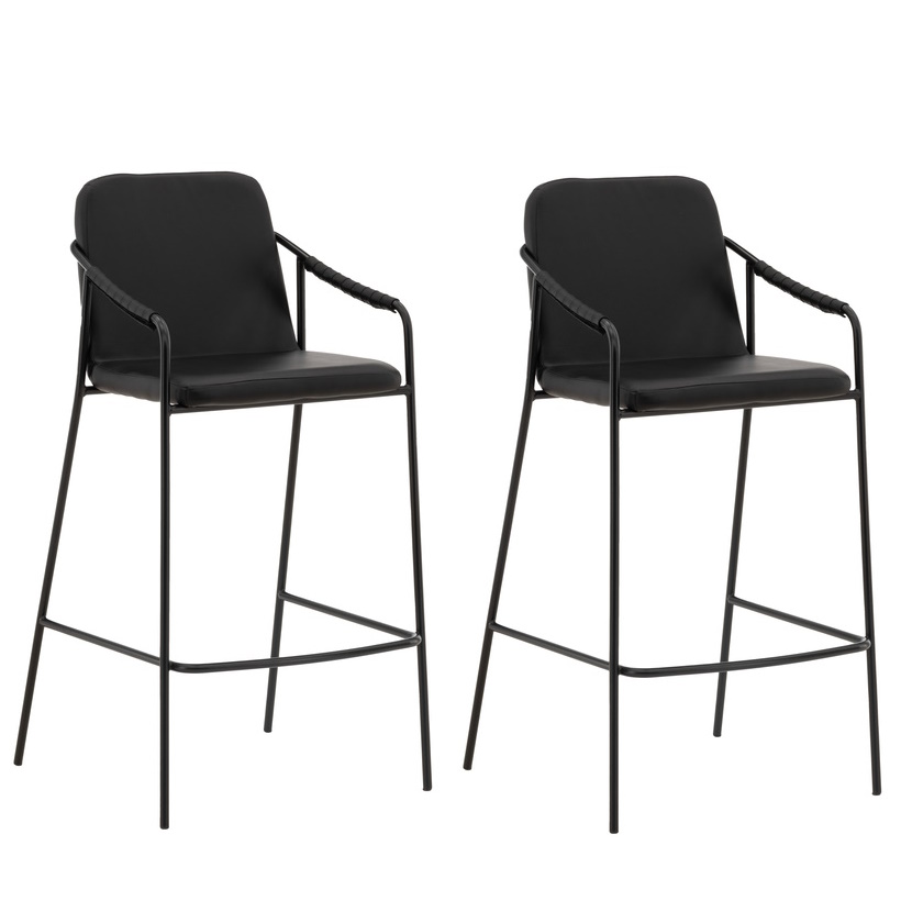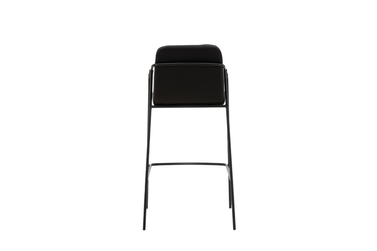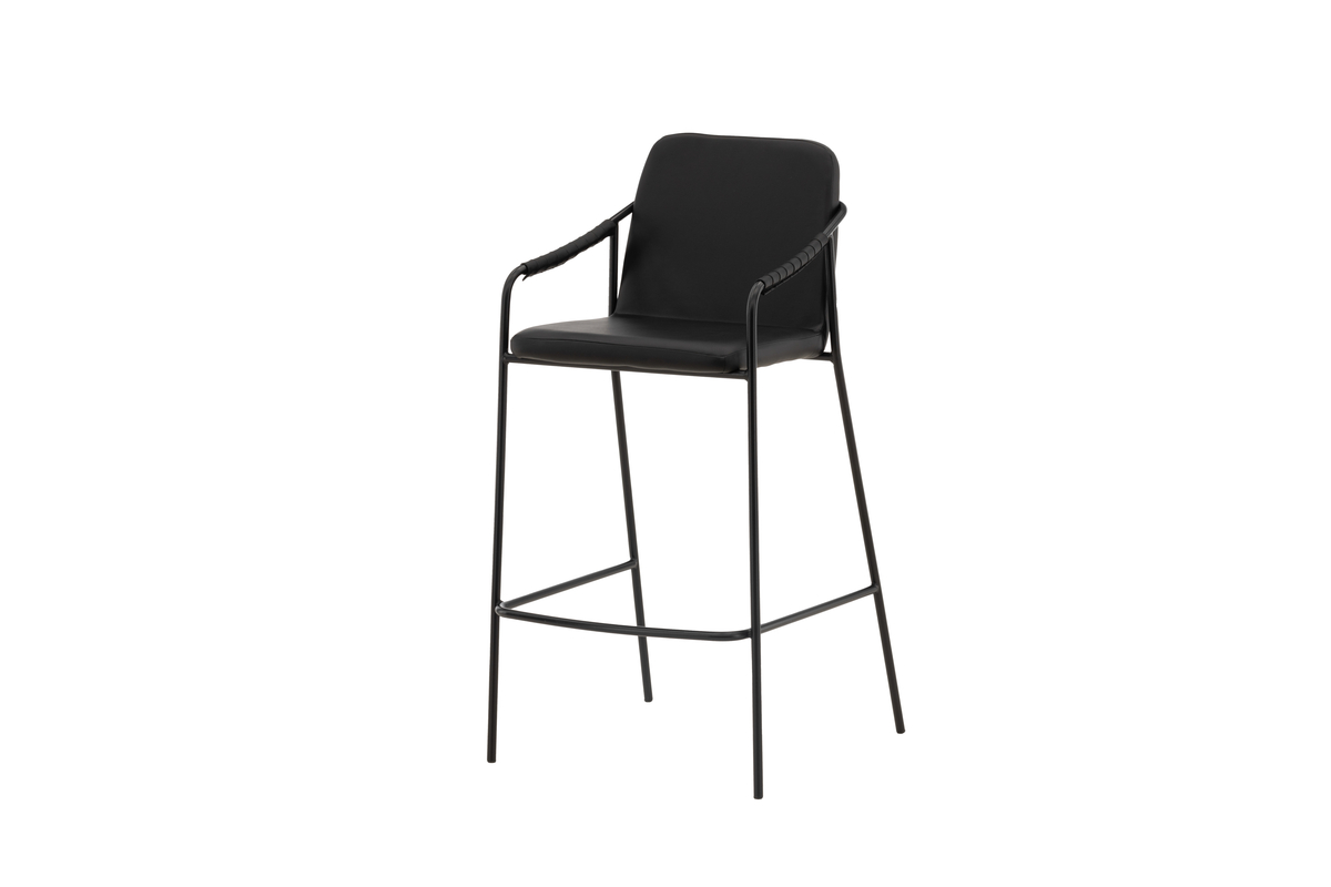 Deze barkruk heeft een gestoffeerde zitting en een volledig bekleed ontwerp in zwart kunstleder, met minimalistische stoelpoten en geïntegreerde armleuningen in zwart staal. Plaats hem bij het keukenblad of aan je bartafel en til je maaltijden naar een hoger niveau met een barkruk die in no-time een stijlvolle eyecatcher in je interieur creëert! (maximale barhoogte 102cm bovenkant barblad)
