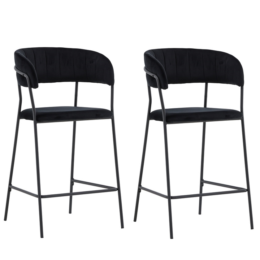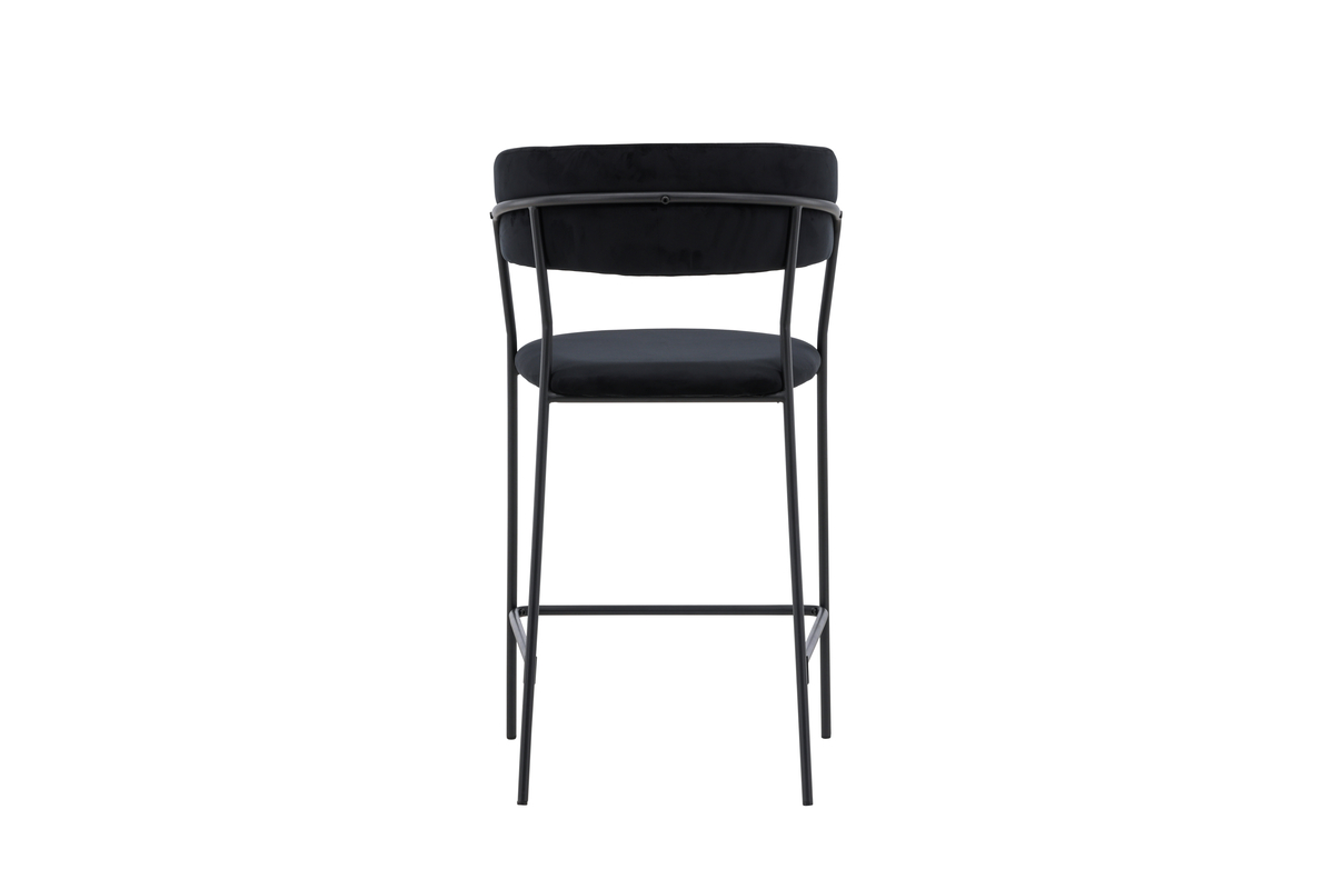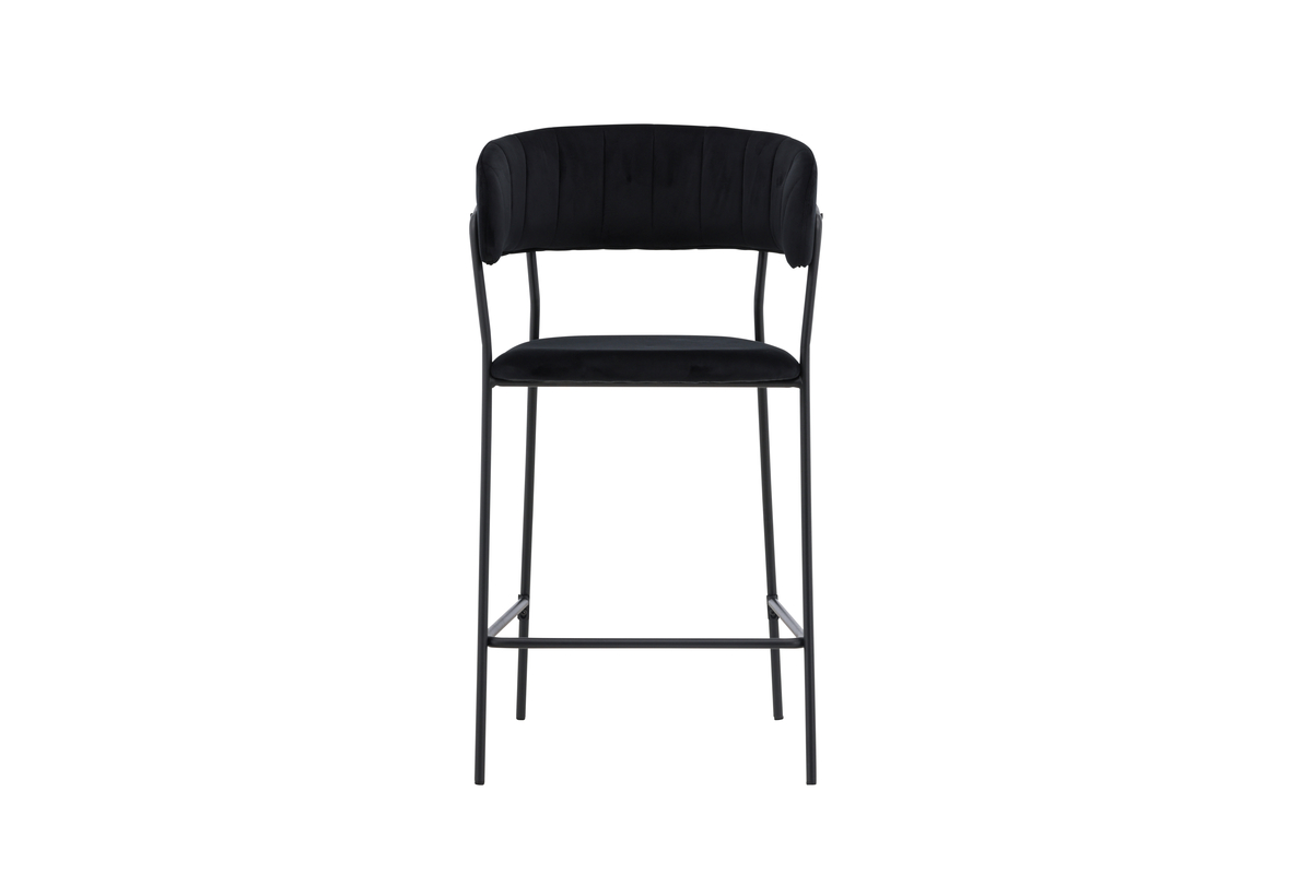 Deze barkruk heeft een volledig gestoffeerd ontwerp met een licht afgeronde rugleuning en zitting in fluweel met stijlvolle sierstiksels. De stoelpoten zijn smal uitgevoerd in zwart staal en voorzien van een geïntegreerde voetsteun gegarandeerd net zo stijlvol als comfortabel.